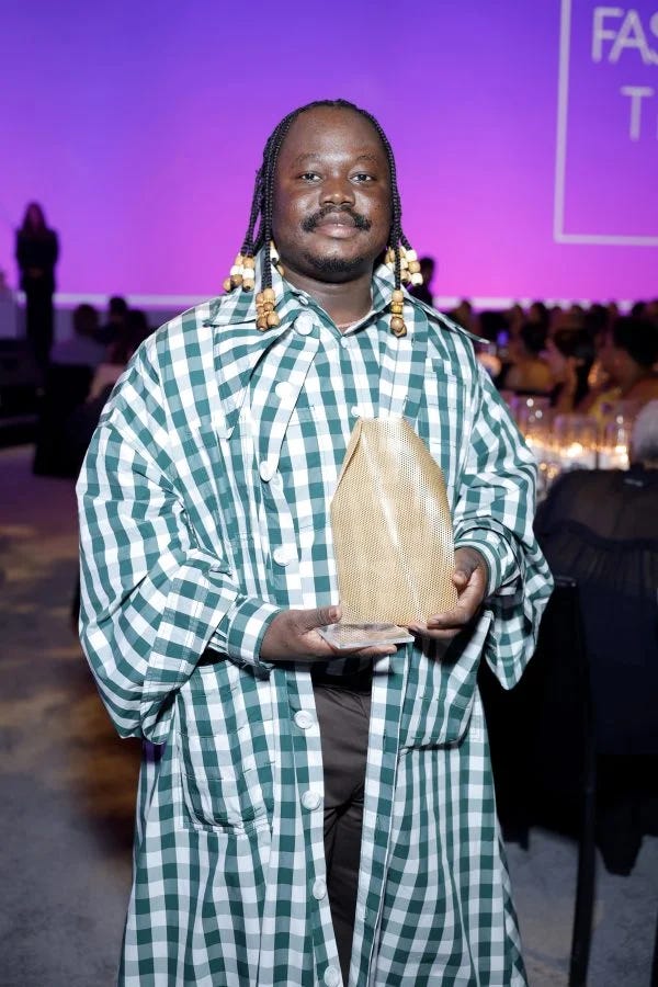 Jacques Agbobly is the winner of the 2023 FTUS Inclusivity Award. This award was created to recognize a brand that fosters a diverse and inclusive environment that acknowledges and utilizes individual’s talents from various backgrounds. Agbolby will receive a $25,000 grant as well as mentoring and business development advise from the Fashion Trust U.S. advisory board.