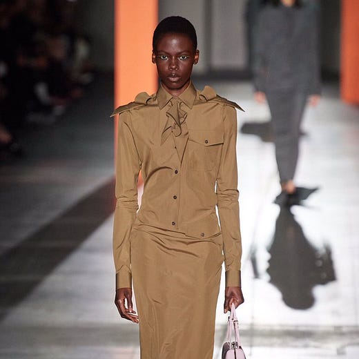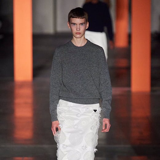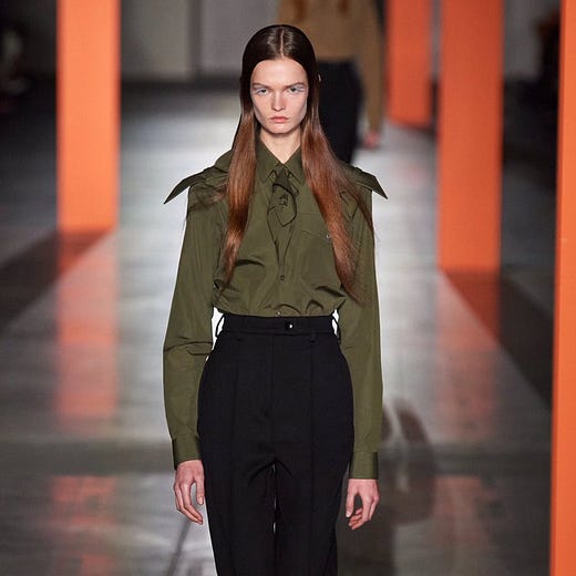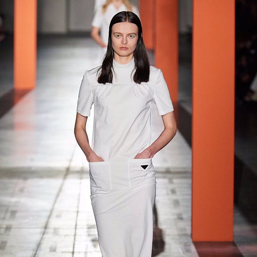 For Prada’s Fall/Winter 2023 collection, Taking Care, Miuccia Prada and Raf Simons drew inspiration from the uniforms of nurses, the military, and the working woman. As the show’s title suggests, this collection is a way of honoring those who “take care” of our society - members of the working class.