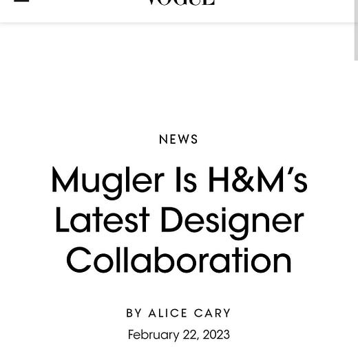 On February 22, 2023, a press release from H&M announced a collaboration between the fast-fashion retailer and the luxury fashion house, Mugler, available in select stores this spring. Although this announcement is only the newest iteration in a long standing history of collabs between high-end brands and accessible retailers, the general reaction to this news greatly differs from those in years past.